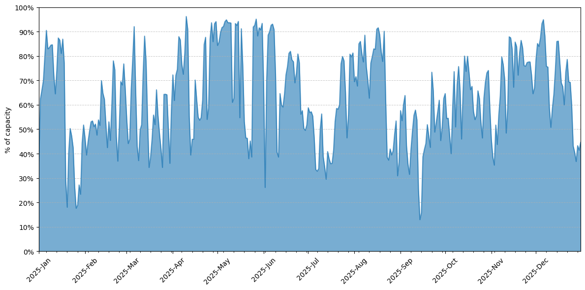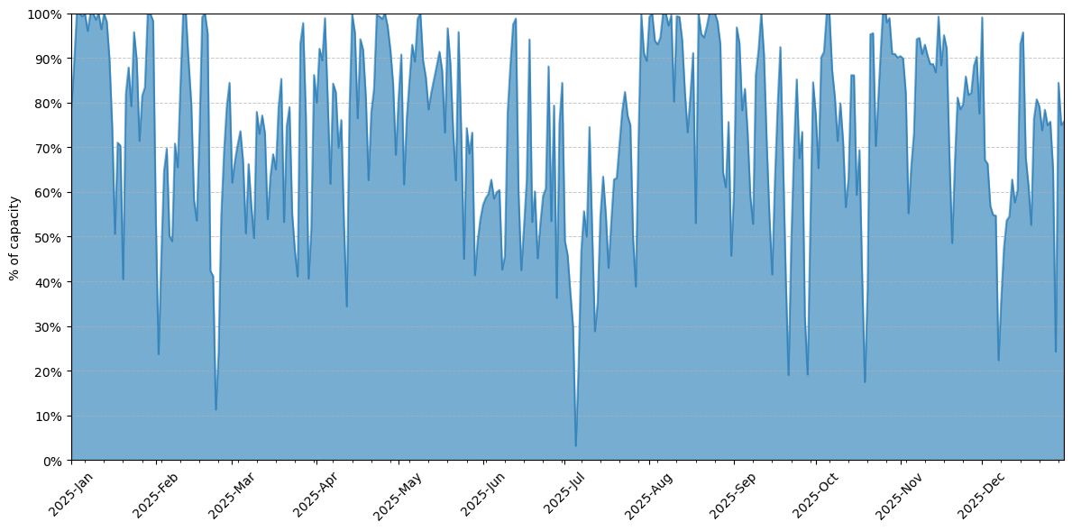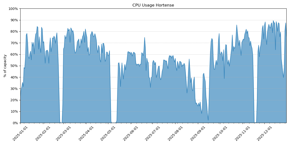 CPU compute time on all partitions of Hydra for 2025. It is shown as a percentage of the theoretical maximum capacity of the cluster.#