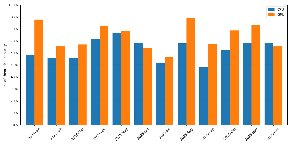 GPU demand remained high, driven by increasing AI/ML workloads. Although average load was stable, peak periods led to noticeable queue times, reinforcing the need for continued GPU expansion and Tier-1 migration of heavy workloads.