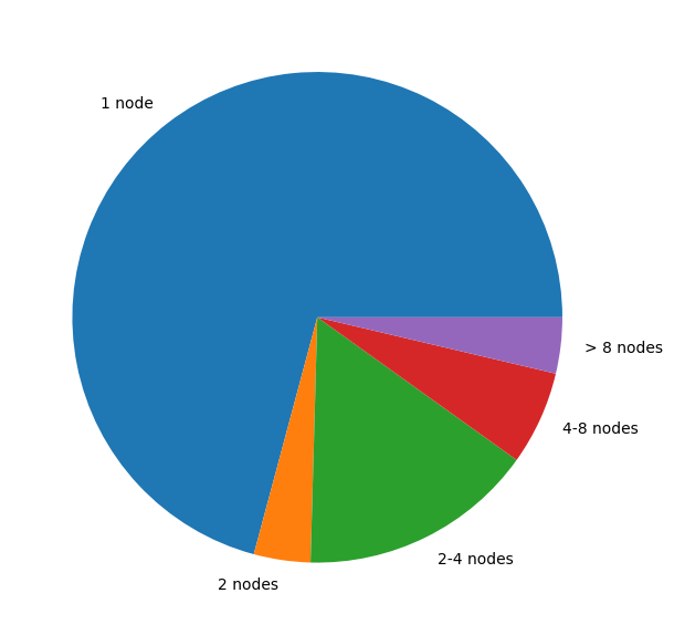 For the remainder of the analysis we only consider jobs which ran for at least 30 minutes as shorter jobs are assumed to be tests or failed jobs. These jobs represent 99% of the used compute time.