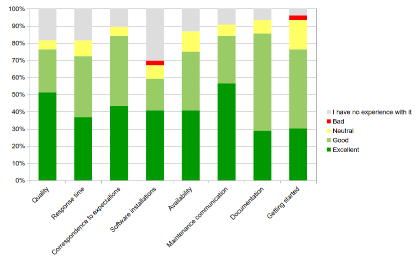 Looking at the responses from those respondents who indicated that they use VUB’s Tier-2 ystems (Hydra, Anansi), we obtain the following percentages of users who rated the service as Excellent or Good (excluding responses marked No Experience):