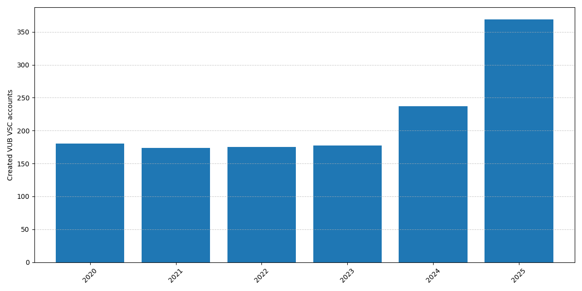 Our efforts to attract more people to the cluster are paying off. In 2025, we invested significant effort in this through targeted introductions and trainings at the request of specific research groups. If you are also interested in such introductions, or would like to receive custom trainings for your research group, please contact us at VUB-HPC Support.